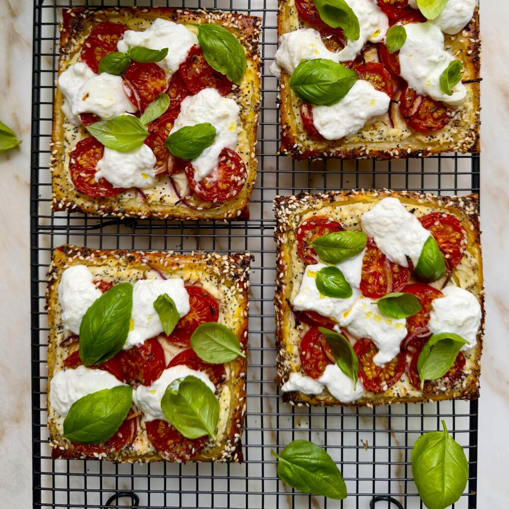 Golden, flaky cherry tomato and ricotta tarts. Heavenly when eaten warm from the oven, topped with creamy burrata and basil for the ultimate finishing touch! Simple, seasonal, and seriously delicious.