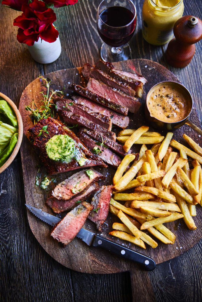 Now you can serve! Serve each rested steak on a plate or serving board. Take the garlic butter from the fridge and unwrap it, then cut some discs to put onto the steak, allowing it to melt. Add the chips to a bowl and serve with the mustardy green salad. Feel free to serve with any additional sauces you like, such as bearnaise or peppercorn. Perfect for a special Valentine’s Day dinner.
