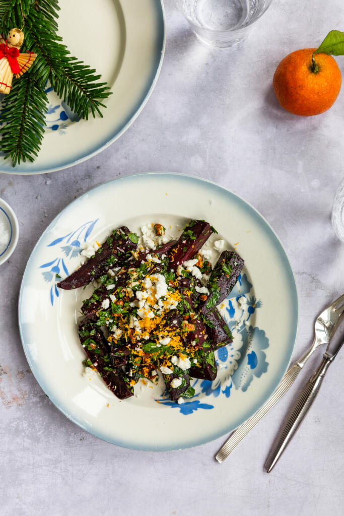 Bagte rødbeder med sprøde mandler, cremet feta, appelsinskal og et strejf af Maldon Salt er den skønneste måde at bruge vinterens rødbeder. Sødt, friskt og perfekt til julebordet eller vintermiddagen.