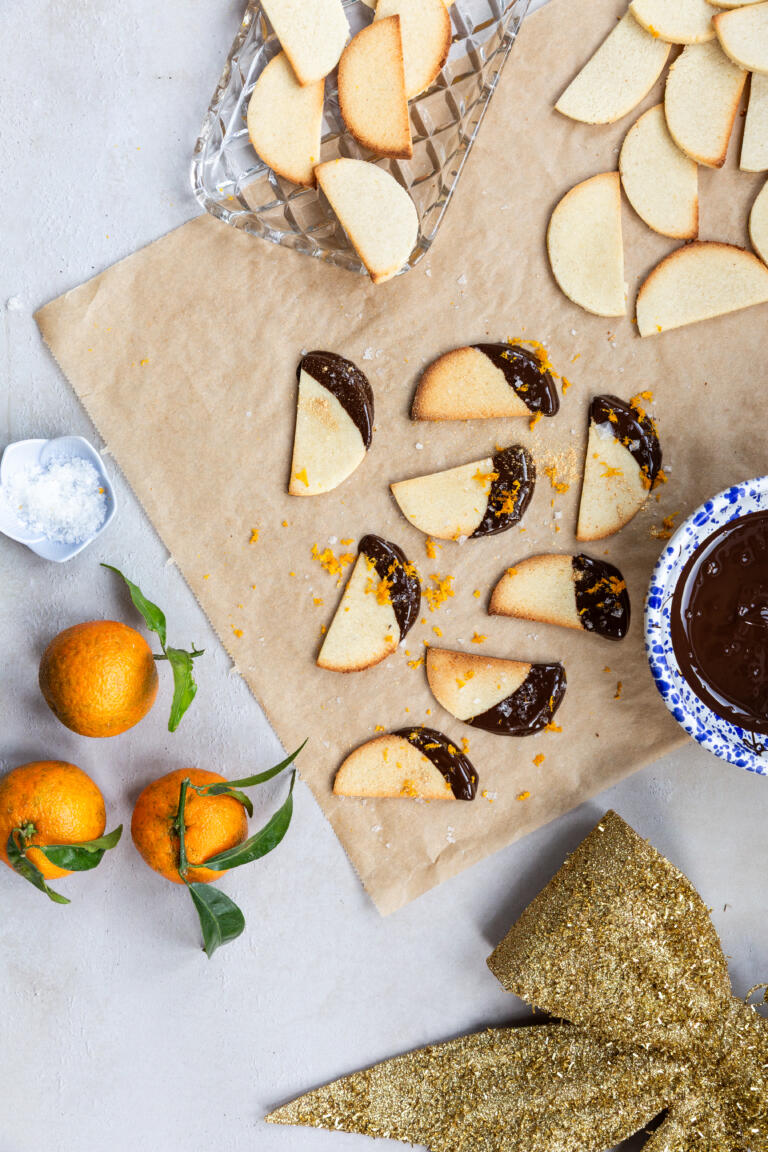 Bagte marcipanstykker dyppet i mørk chokolade og drysset med Maldon Salt