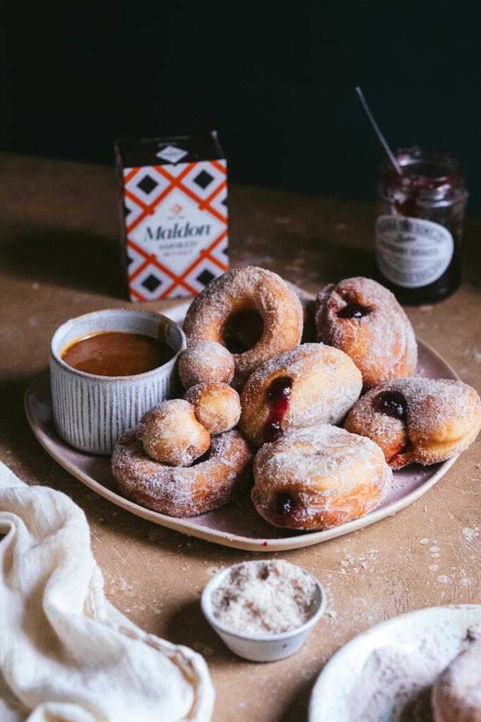 Homemade doughnuts, filled with Tiptree Raspberry Seedless Conserve and Maldon Smoked Sea Salt caramel.