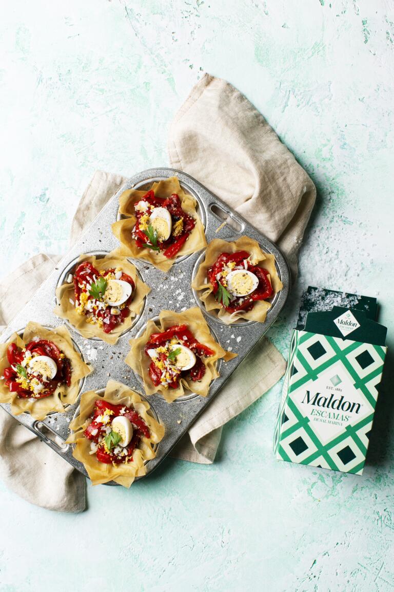 Un entrante crujiente y elegante que combina pimientos del piquillo, huevo de codorniz y el toque final de las escamas® de Sal Maldon®,...
