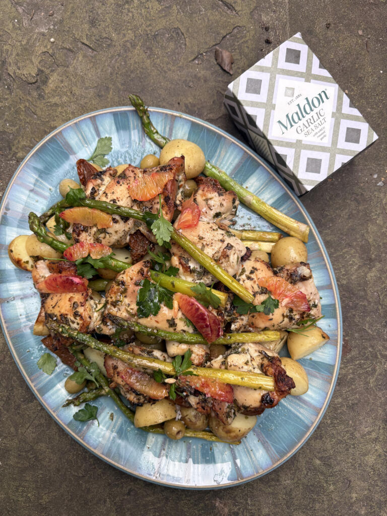 Welcome the fresh flavours of spring with this vibrant lemon and herb chicken with Maldon Garlic Sea Salt – a dish that sings with brightness and depth. Tender, juicy chicken thighs are infused with lemon juice, olive oil, thyme, parsley, pepper and a generous pinch of garlic sea salt to create a beautifully aromatic base. Paired with baby potatoes, crisp asparagus, and the rich umami of sundried tomatoes.
