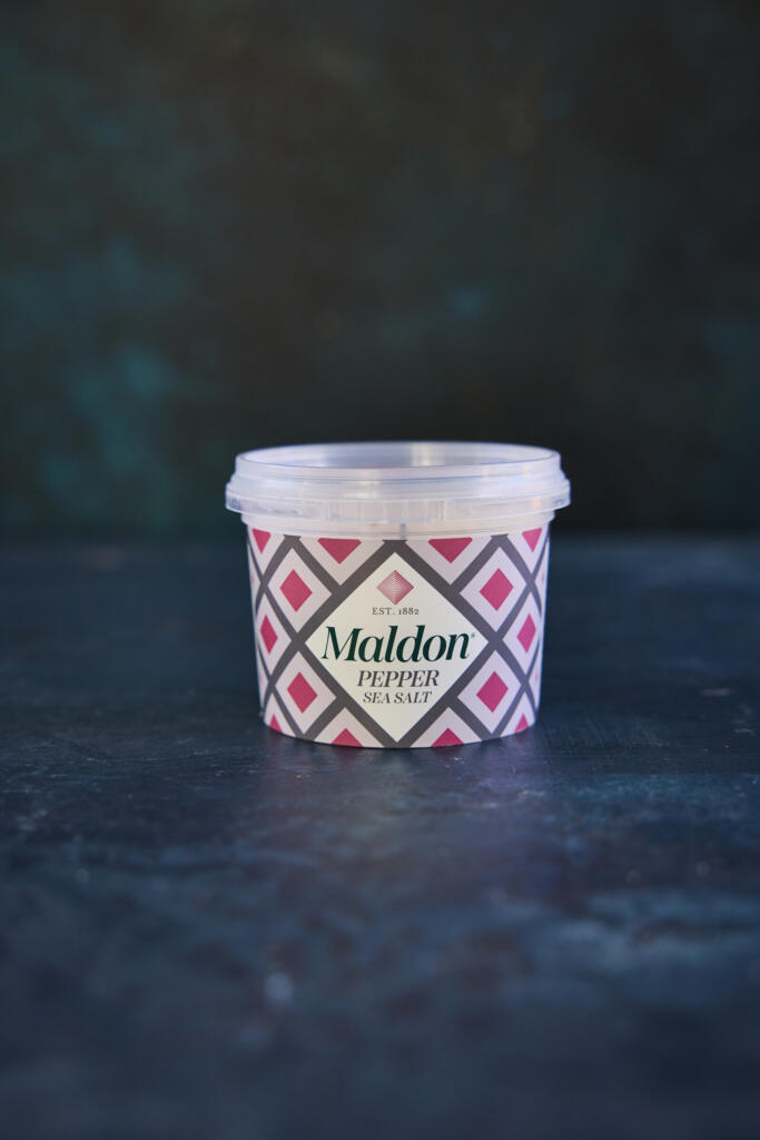 Maldon Pepper Sea Salt Flakes 50g – hand-harvested, pyramid-shaped flakes blended with Tellicherry pepper and pink peppercorns for a warm, fruity, peppery taste that’s great with eggs, steak or crispy calamari. Fantastic flavour at your fingertips.