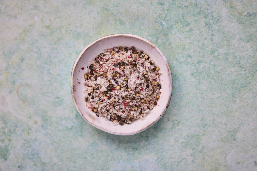 Ingredients: sea salt flakes (81%), Tellichery pepper (13%), pink peppercorns (6%)