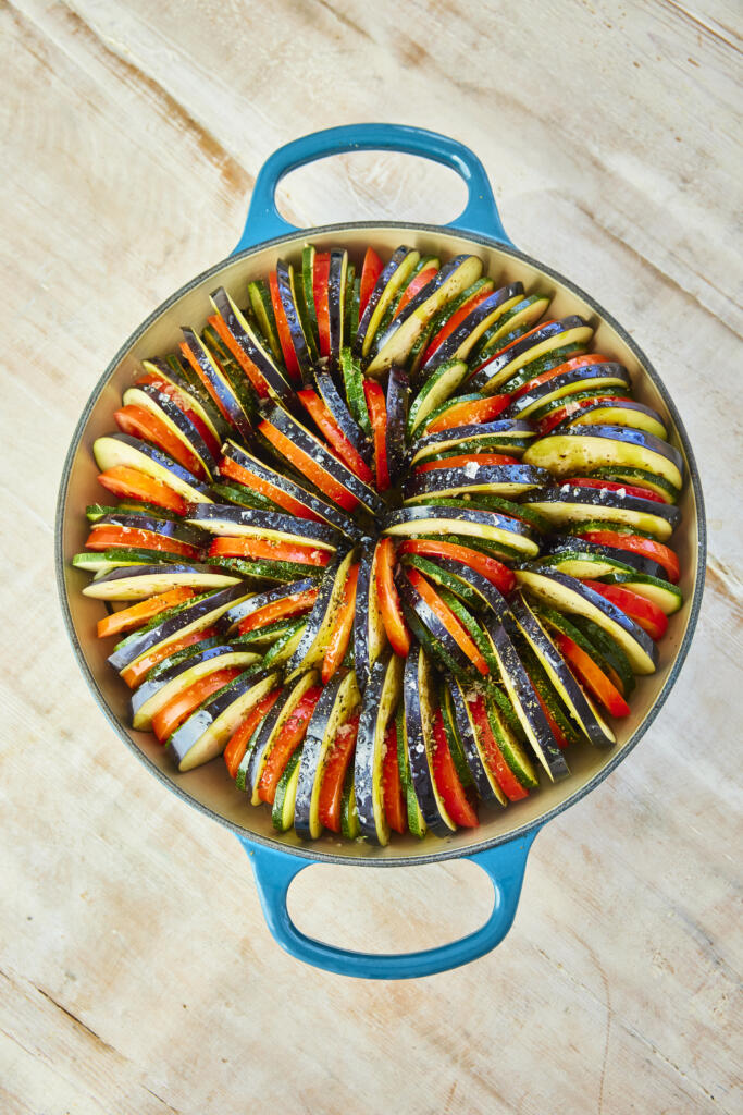 - This is a sliced, baked version (often called confit byaldi style) with neat layers; classic ratatouille is a chopped, stovetop stew.