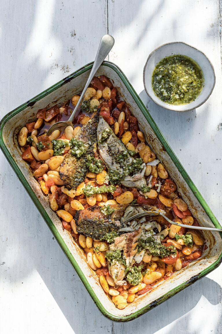Grilled Mackerel, Oregano and Lemon Pesto with Greek-style Butter Beans