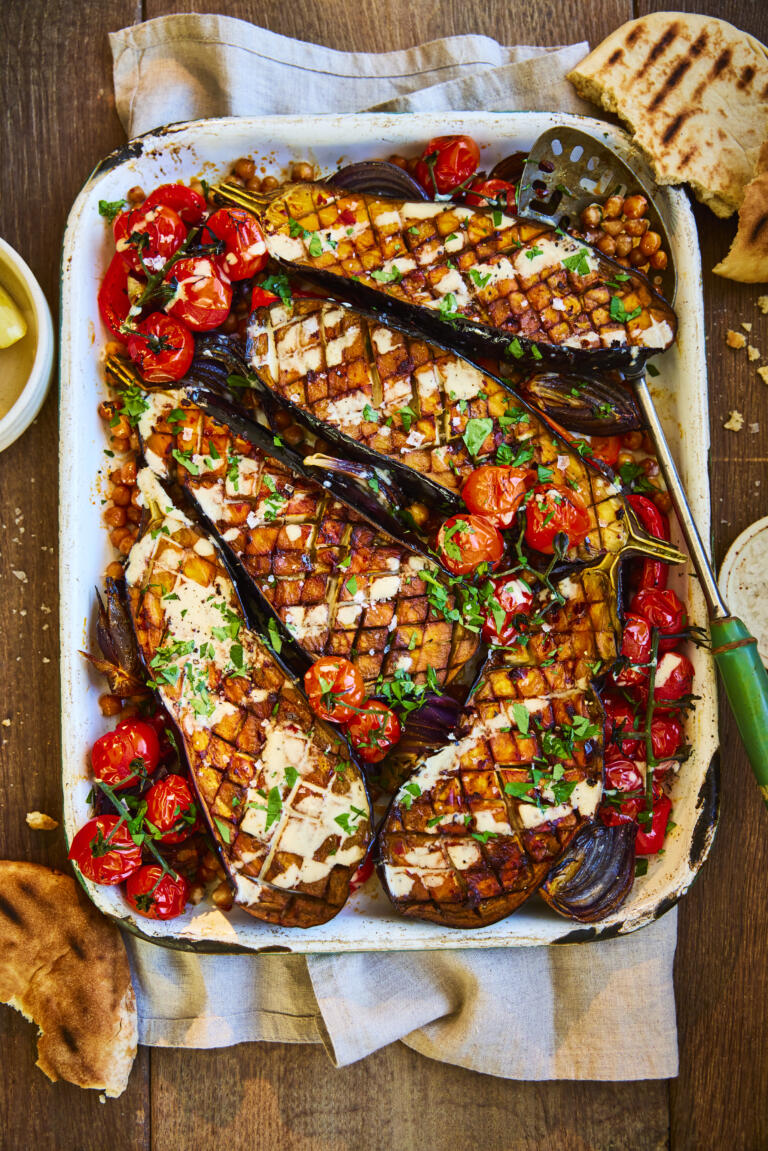 This aubergine traybake with tahini dressing is a Middle Eastern-inspired dish that combines bold flavours with vibrant textures in a single roasting tin....