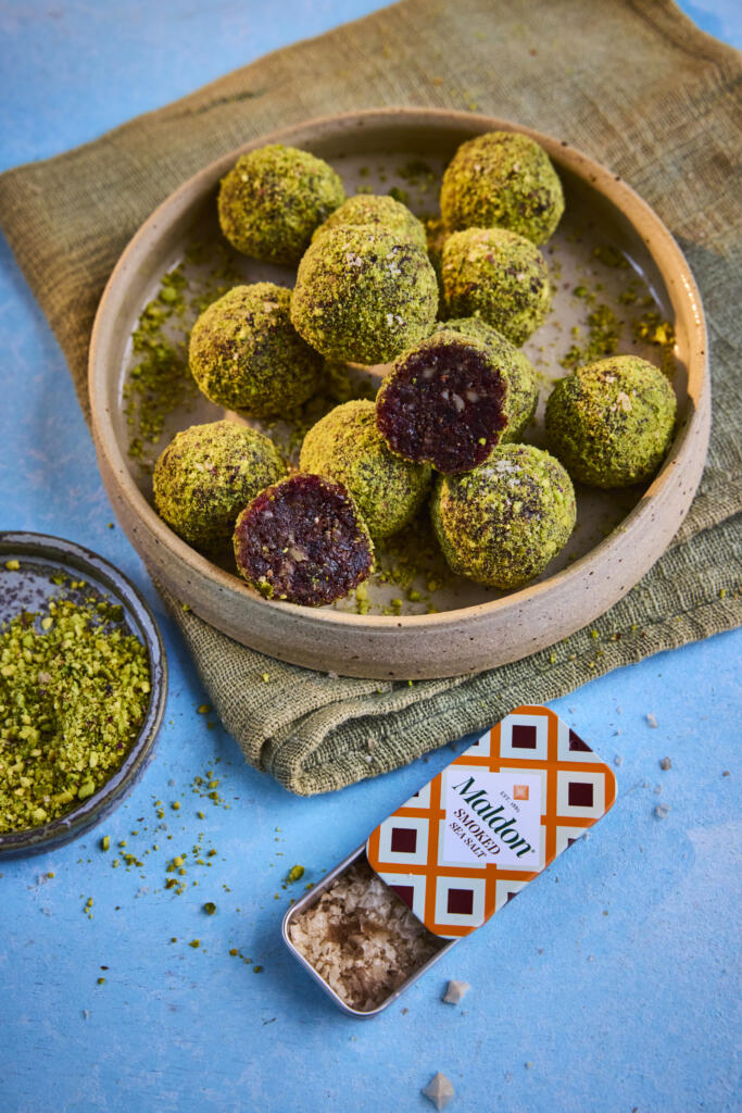 - With slightly damp hands, roll out small golf ball sized balls of the mixture. Then roll each ball in the ground pistachios from earlier. Set these onto a tray and into the fridge for 15 minutes to firm up.